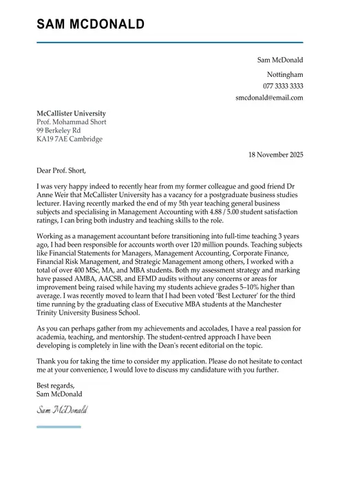 I was very happy indeed to recently hear from my former colleague and good friend Dr Anne Weir that McCallister University has a vacancy for a postgraduate business studies lecturer. Having recently marked the end of my 5th year teaching general business subjects and specialising in Management Accounting with 4.88 / 5.00 student satisfaction ratings, I can bring both industry and teaching skills to the role.