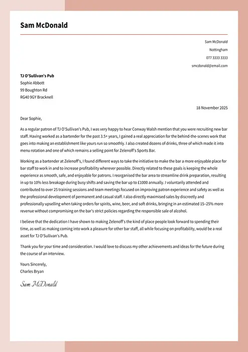 A good bar cover letter should include a strong summary of the skills and achievements mentioned in the first 2–3 paragraphs. Tie up all loose ends and wrap everything up in a couple or so sentences. Hammer home the point that these bar skills could be very useful to the establishment to which you’re applying.