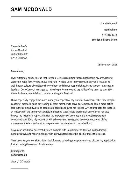 I was extremely happy to read that Tweedle Dee’s is recruiting for team leaders in my area. Having worked in retail for 6+ years, I have long had Tweedle Dee’s in my sights, mainly as a result of its well-known culture of employee involvement and shared responsibility. In my current role as team leader at Cosy Corner, I managed to raise the performance and capability of my team by over 15% through clear accountability, coaching and regular feedback.