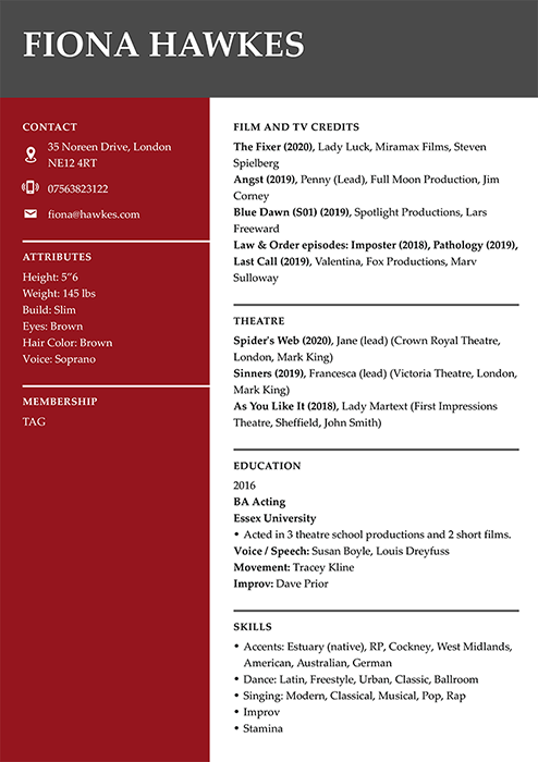 This summary could also include details about your voice, accents, singing, etc. You could also list these in a separate ‘Skills’ section, which we will opt for in our acting CV example.