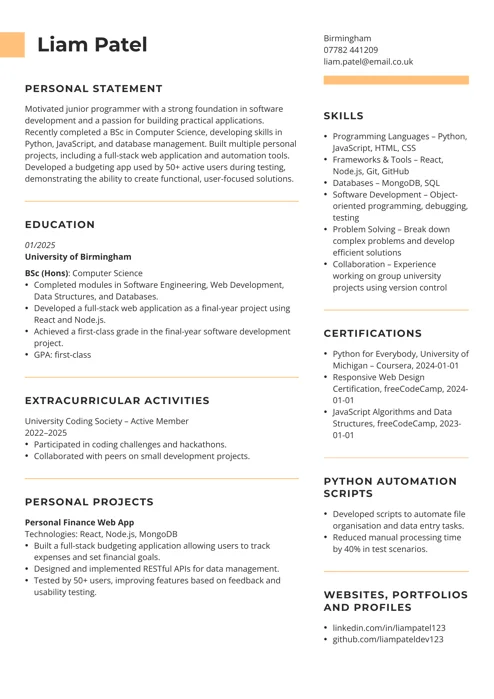 As a recent graduate with limited professional experience, position the education section at the top of your CV to emphasise your academic achievements, coursework, and research projects that directly relate to AI. This approach highlights your potential and technical foundation in the field while your professional experience is still growing.