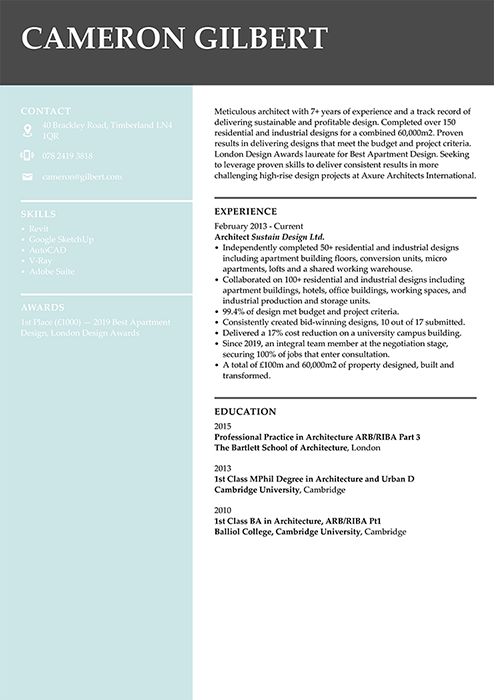 We know you design things for a living, so we won’t tell you what CV font to use. Remember, though, to send your architect CV as pdf and not go overboard with the file size. You know how to use white space and margins for a clean CV layout.