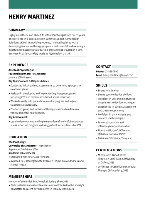 Augment your assistant psychologist CV with an education section that lists relevant qualifications as follows: [Degree Class] [Degree Name] (Year Graduated) at [University Name]. If experience is scant, bolster it with achievements, extracurricular activities, and your specialisations.