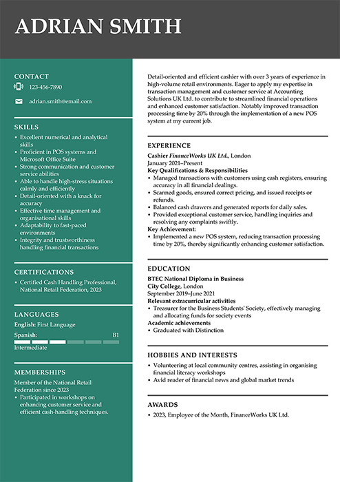 This sample cashier CV effectively highlights customer service skills by presenting relevant experience. Starting from the personal statement, this CV for cashier jobs uses a tailored approach by stating how the company can benefit from hiring this person. It also mentions an impressive achievement for a cashier, even before showing the work history. If you follow this tailored, personalised approach, your cashier CV will stand out from the rest, and as a result, you will get noticed by hiring managers.