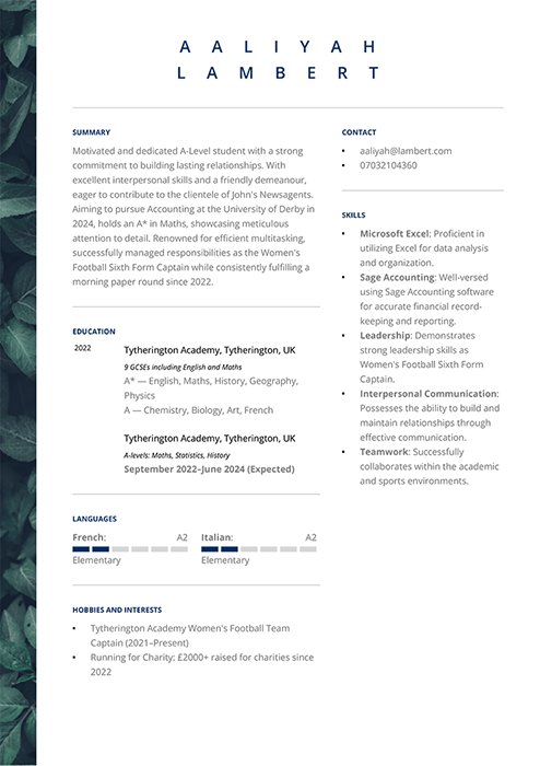 In the CV education section of your CV for a 16-year-old, list your grades above A. If you have a lot of lower grades, for example, four passing grades, simply record it as ‘4 GCSEs’. If they include Maths and English, specify that; those are more important.