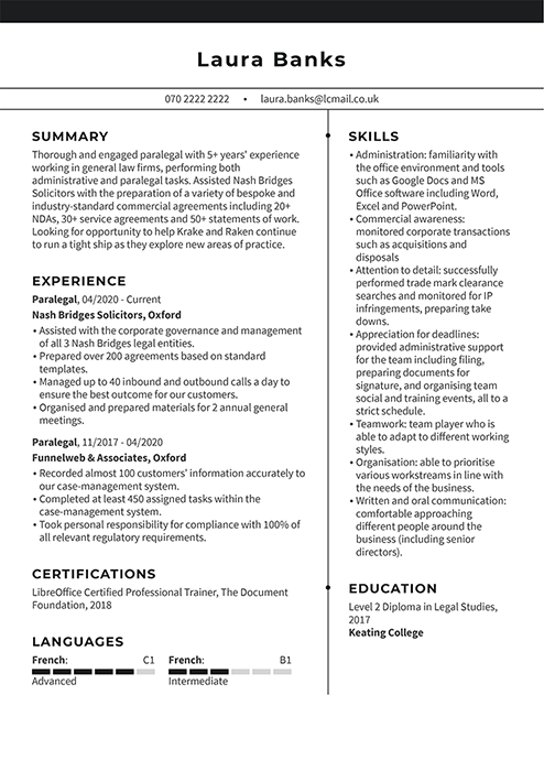 Open a new document file and list all the paralegal CV skills you can think of (hard and soft skills). Once you’ve run out of steam, go back to the beginning and add a sentence to each skill in which you outline how you’ve demonstrated that skill at work. Any skill for which you can’t do this doesn’t make the cut.