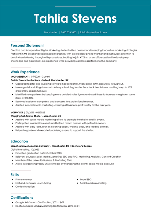 You can check our expert CV examples tailored to 60+ jobs if you seek specific samples to help your student CV. Find dedicated CVs for professions that might interest fresh graduates; these can be a receptionist CV, a sales assistant CV, a marketing CV, and many more. We’ve also got different guides to help you write your first CV, linked at the beginning of this article.