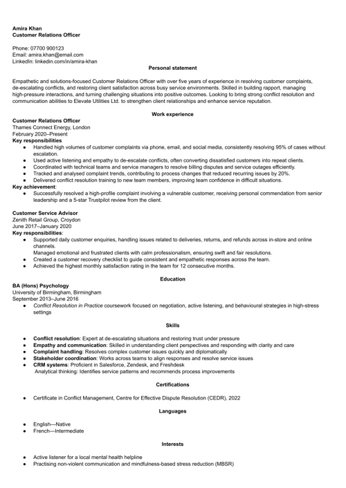 Empathetic and solutions-focused Customer Relations Officer with over five years of experience in resolving customer complaints, de-escalating conflicts, and restoring client satisfaction across busy service environments. Skilled in building rapport, managing high-pressure interactions, and turning challenging situations into positive outcomes. Looking to bring strong conflict resolution and communication abilities to Elevate Utilities Ltd. to strengthen client relationships and enhance service reputation.